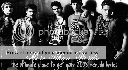 Hey Menudo fans! This is Melissa (Mel_Rocks) here and this is where I have posted all of the lyrics to Menudo's songs. Please understand that I have no idea whether any of these lyrics are 100% correct, because on all of them I just sat down and listened to the song over and over and wrote what I heard.Please comment the blog of the song if there are any errors in the lyrics. Note: - If there is a line in this color, this means I'm not sure if it's correct. - If there is a line with ?? in it, this means that I have NO IDEA what it could be. Lyrics